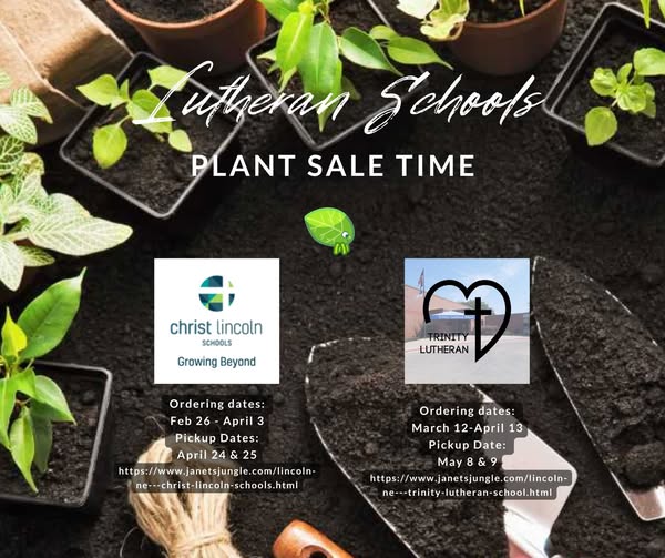This is the last week to order plants from Janet’s Jungle through Trinity Lutheran School. Plants ordered through Trinity can be picked up on May 8th and 9th (or will be delivered to church on May 10).