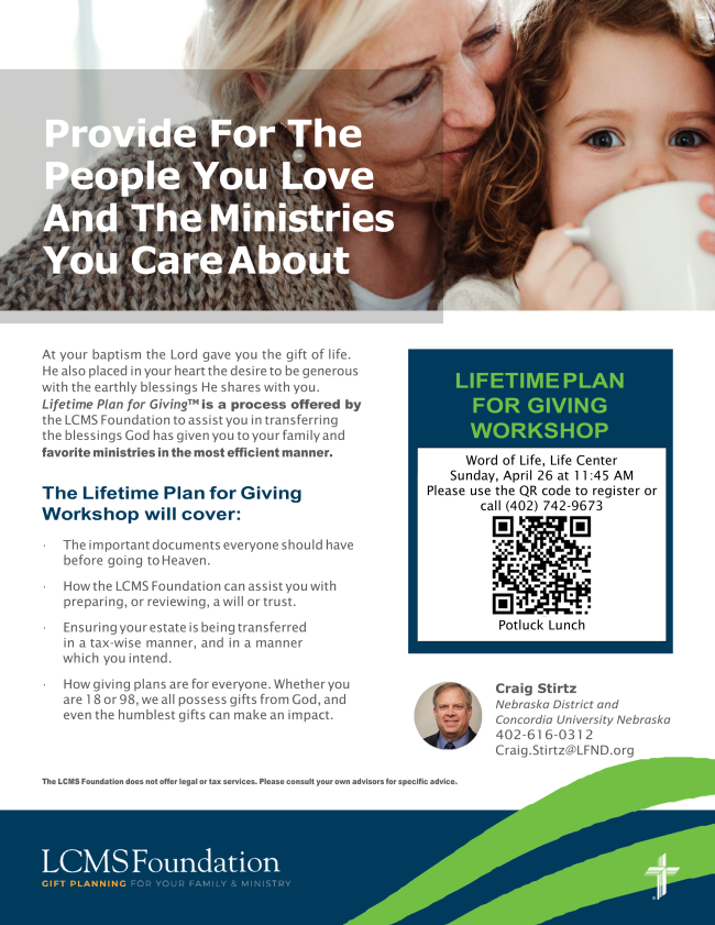Join us at Word of Life Lutheran Church on Sunday, April 26, beginning at 11:45 AM in our Life Center to learn valuable information about how careful estate planning can be a great blessing for you, your loved ones and for the ministries you wish to support. Please sign up by using the QR code to register or notify the church office of your interest by calling (402) 742-9673, or by emailing WOLLincolnOffice@gmail.com .
