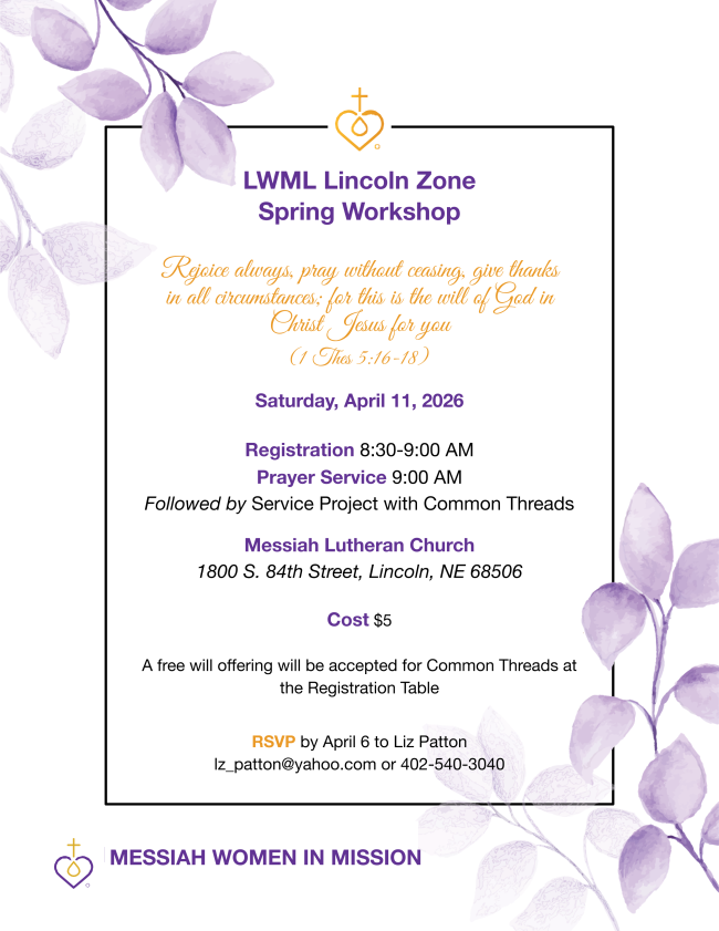 April 11, 9-Noon: LWML Spring Workshop at Messiah Lutheran Church, a prayer service with service project