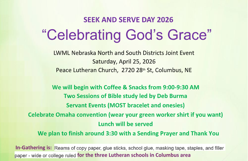 April 25: 9:30-3:30pm: Seek and Serve Day in Columbus, Nebraska, a Bible Study, Speaker, and service project.
