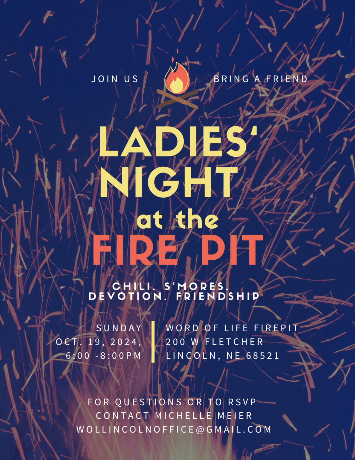 October 19th, we’ll gather at the firepit for a great time! Dee’s hubby’s famous chili will be served along with deluxe smores! We’ll meet 6-8pm.