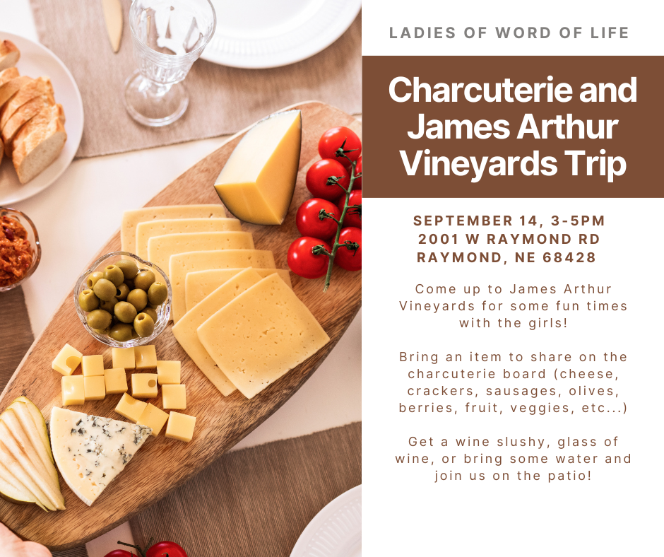 Join us for a relaxing afternoon at the winery! We’ll meet at James Arthur Vineyards on Sunday, September 14th, 3-5pm. Grab a glass of wine from the tasting room, and join us on the patio for some fellowship and music. Bring a charcuterie snack to share (sausage, cheese, crackers, fruit, chocolates, etc…)